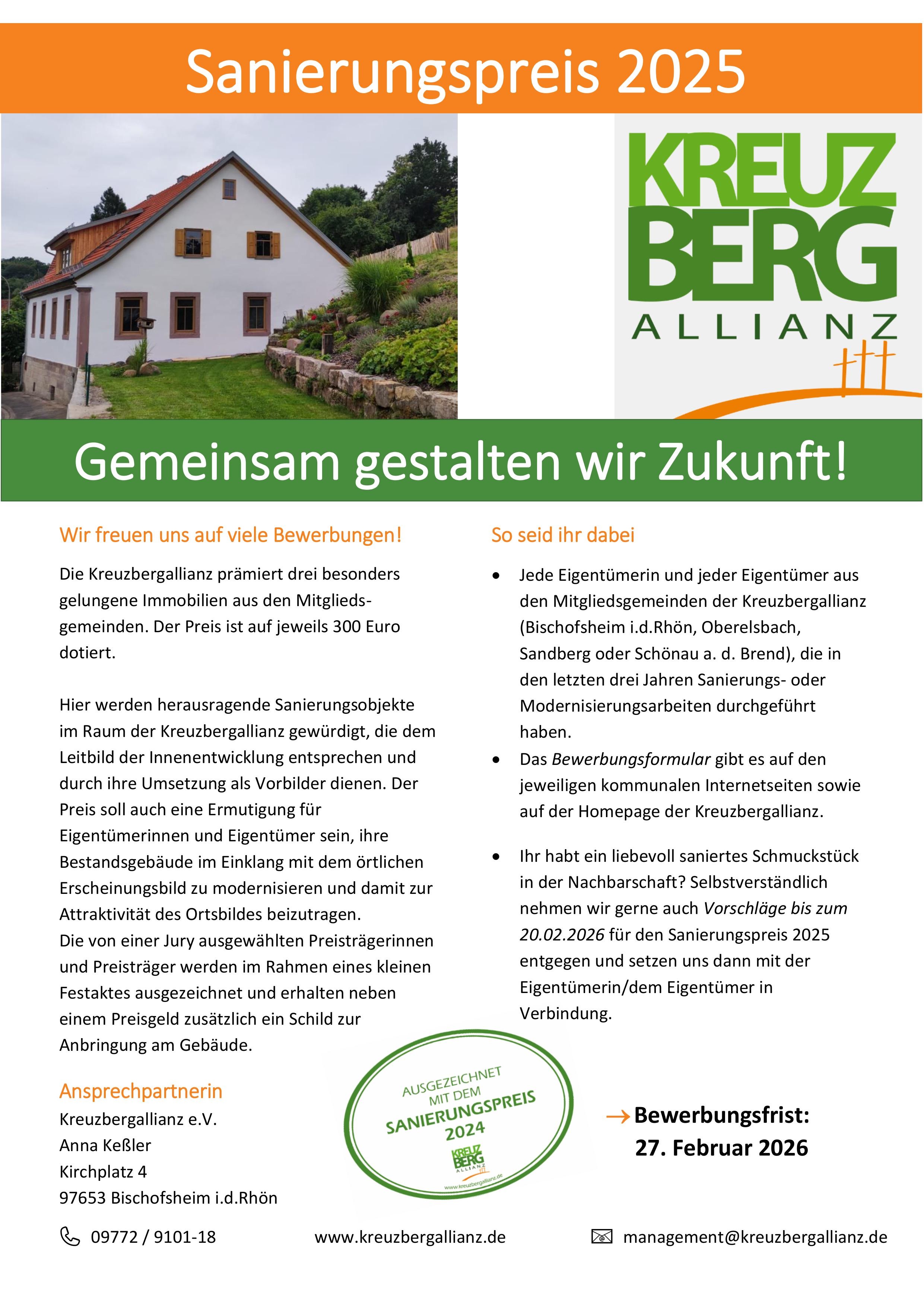 Bewerben können sich alle Eigentümer/innen, deren Haus in einer der Mitgliedsgemeinden der Kreuzbergallianz (Bischofsheim i.d.Rhön, Oberelsbach, Sandberg oder Schönau a. d. Brend) liegt und in den letzten drei Jahren saniert oder modernisiert wurde.