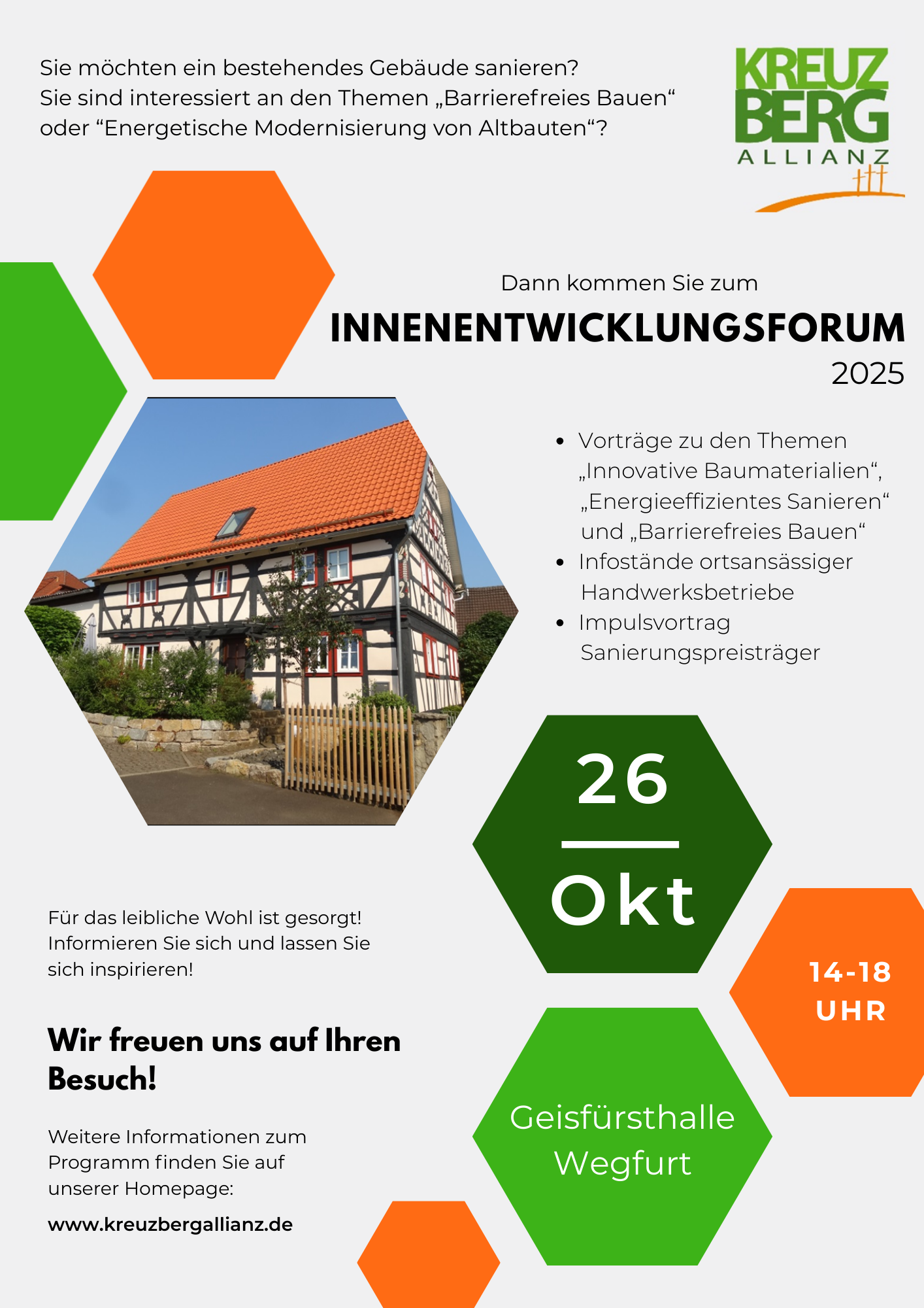Um dieses wichtige Thema stärker in den Fokus zu rücken, lädt die Kreuzbergallianz herzlich zum Innenentwicklungsforum am 26. Oktober 2026 von 14–18 Uhr in der Geisfürsthalle Wegfurt ein.